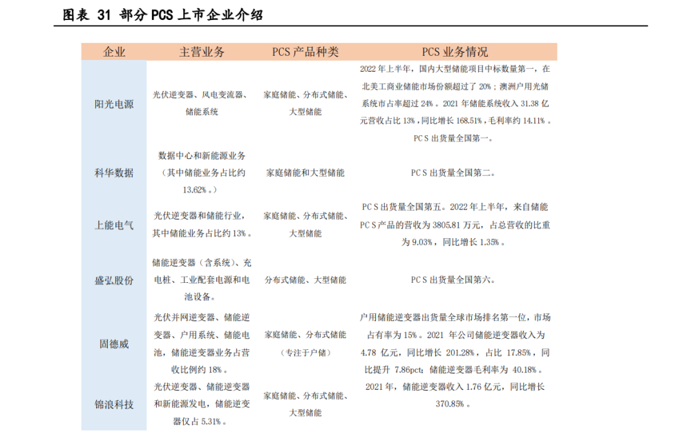 2021 年,中國新增投運的電化學(xué)儲能項目中,裝機規(guī)模排名前十位的儲能逆變器提 供商,依次為:上能電氣、科華數(shù)能、索英電氣、南瑞繼保、陽光電源、盛弘股份、華 自科技、智光儲能、匯川技術(shù)和許繼。 目前從事逆變器的上市企業(yè)主要有上能電氣、固德威和錦浪科技等。從產(chǎn)品結(jié)構(gòu)來 看,上能電氣、固德威以光伏逆變器為主,錦浪科技以組串式逆變器為主。從營收來看, 錦浪科技營收位于行業(yè)較高水平,2021 年為 33.12 億元。從營收增速看,固德威成長較 快,2021 年營收增速達 68.53%,毛利率達到 31.7%,凈利率達 10.4%。隨著國內(nèi)逆變器 企業(yè)快速發(fā)展,國產(chǎn)逆變器在海外的競爭優(yōu)勢凸顯。受到國內(nèi)市場政策波動影響,尤其 是 2018 年 531 新政后,國內(nèi)逆變器企業(yè)加快拓展海外渠道,加速海外布局。2021 年, 全球逆變器出貨量前十大公司中中國企業(yè)獨占 6 席,其中華為、陽光電源逆變器出貨量 分列全球第一、第二,分別為 52GW 和近 48GW,第三名為海外公司,其出貨量為 15GW 左 右,與華為、陽光電源存在較大差距。