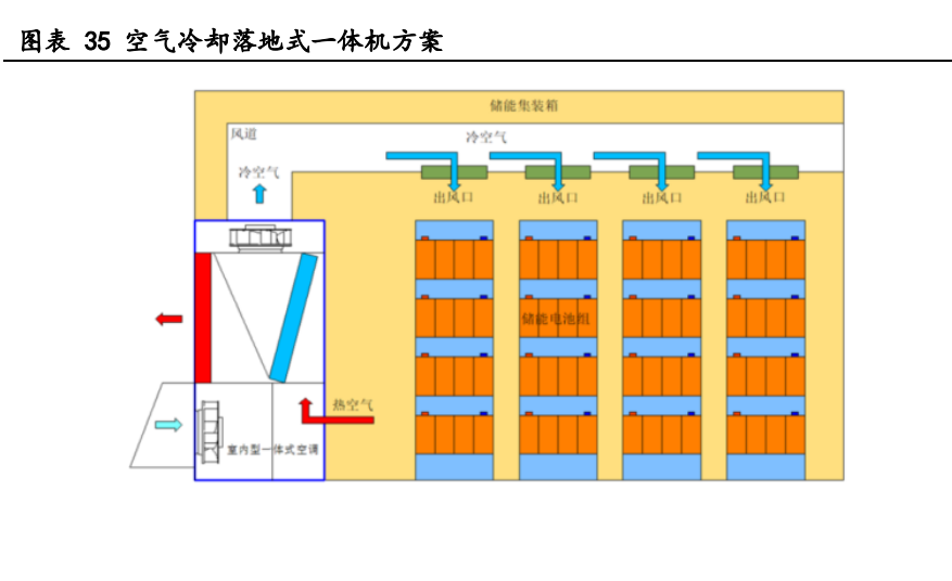 風(fēng)冷溫控系統(tǒng)一般由儲能溫控廠商直接提供整體系統(tǒng)產(chǎn)品,其中核心部件包括壓縮 機、風(fēng)機、換熱器等。風(fēng)冷具備方案成熟、成本低、結(jié)構(gòu)簡單等優(yōu)點,但同時由于空氣 的比熱容低,導(dǎo)熱系數(shù)低,風(fēng)冷一般應(yīng)用于功率較低場景。