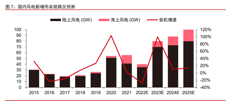 風(fēng)電:受疫情等因素影響,2022 年部分風(fēng)電項(xiàng)目裝機(jī)將延后至 2023 年。2022 年 1-11 月,國(guó)內(nèi)風(fēng)電新增并網(wǎng)量達(dá) 22.52GW(-6.8% YoY),預(yù)計(jì)全年新增并網(wǎng)規(guī)模達(dá) 40GW 左 右,同比或有所回落。這主要是由于疫情影響設(shè)備生產(chǎn)交付和項(xiàng)目現(xiàn)場(chǎng)吊裝節(jié)奏,同時(shí)疊 加機(jī)型方案升級(jí)換代,以及部分項(xiàng)目場(chǎng)址審批周期拉長(zhǎng)影響。我們預(yù)計(jì)有 10GW 左右陸上 風(fēng)電項(xiàng)目裝機(jī)將由于外部因素由 2022 年延至 2023 年,短期裝機(jī)需求低于預(yù)期或?yàn)?2023 年需求復(fù)蘇進(jìn)一步夯實(shí)基礎(chǔ)。隨著疫情影響逐步緩解,風(fēng)電經(jīng)濟(jì)性大幅提升,以及 2022 年部分延遲項(xiàng)目結(jié)轉(zhuǎn),2023 年國(guó)內(nèi)風(fēng)電裝機(jī)有望顯著復(fù)蘇,預(yù)計(jì)總裝機(jī)量將達(dá) 80GW 左 右,其中海上風(fēng)電裝機(jī)有望實(shí)現(xiàn)翻倍增長(zhǎng)至 10GW 以上,且 2023-25 年海風(fēng)裝機(jī)仍有望 維持約 40%的較高 CAGR。