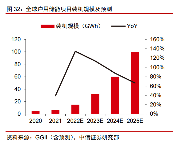 電價(jià)攀升+能源危機(jī),推動(dòng)歐洲戶儲(chǔ)項(xiàng)目經(jīng)濟(jì)性和配置意愿持續(xù)高漲。歐洲電價(jià)在近 年來(lái)天然氣價(jià)格大幅上漲情況下持續(xù)攀升,推動(dòng)戶用光伏+儲(chǔ)能項(xiàng)目經(jīng)濟(jì)性顯著增強(qiáng)。據(jù) BNEF 統(tǒng)計(jì),2021 年歐洲戶儲(chǔ)項(xiàng)目新增規(guī)模達(dá) 1.04GW/2.05GWh(+56%/+73% YoY)。 而 2022 年俄烏沖突進(jìn)一步推升歐洲能源成本行至高位,且能源危機(jī)背景下歐洲居民配套 光儲(chǔ)系統(tǒng)積極性空前高漲,儲(chǔ)能滲透率快速提升,為未來(lái)幾年戶儲(chǔ)行業(yè)奠定高景氣基調(diào)。 在以歐洲為主要戶儲(chǔ)市場(chǎng)的高增長(zhǎng)支撐下,GGII 預(yù)計(jì)全球戶儲(chǔ)市場(chǎng)容量將由 2021 年的 6.4GWh 大幅增至 2025 年的 100GWh。