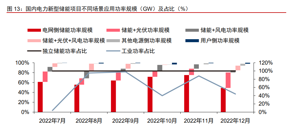 其三,電網(wǎng)側(cè)獨(dú)立儲(chǔ)能與電源配儲(chǔ)為主,用戶側(cè)工商業(yè)占比逐漸提升。從應(yīng)用場(chǎng)景來(lái) 看,新型儲(chǔ)能項(xiàng)目主要集中于電網(wǎng)側(cè)(100%為獨(dú)立儲(chǔ)能)與電源側(cè)配儲(chǔ)(95%為新能源 配儲(chǔ))。用戶側(cè)儲(chǔ)能項(xiàng)目功率規(guī)模占比仍較低,但其中工業(yè)項(xiàng)目占比逐步穩(wěn)定在 50%以上。