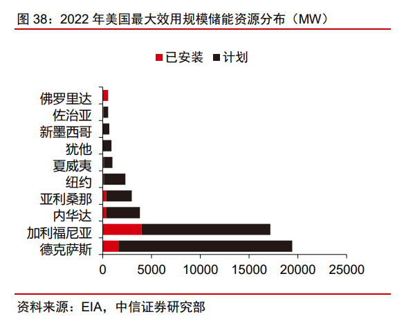 根據(jù) EIA 數(shù)據(jù),美國(guó) 2021 年電力結(jié)構(gòu)中,天然氣+煤電發(fā)電量占比 60%。各州規(guī)劃 可再生能源發(fā)電市場(chǎng)配額方案,加州計(jì)劃 2030 年實(shí)現(xiàn) 60%的可再生能源占比。美國(guó)儲(chǔ)能 集中于加州和德州。截至 2022 年 8 月,加州儲(chǔ)能裝機(jī)完成 3977MW,在建 13198MW, 德州儲(chǔ)能裝機(jī)完成 1653MW,在建 17789MW。2021 年加州風(fēng)+光的發(fā)電量占總發(fā)電量比 例為 25%,德州風(fēng)光發(fā)電占比 24%,高于美國(guó)全國(guó)的 13%。