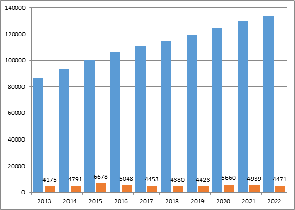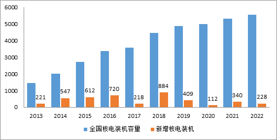圖10 2013—2022年核電裝機(jī)和新增裝機(jī)情況(單位:萬(wàn)千瓦)