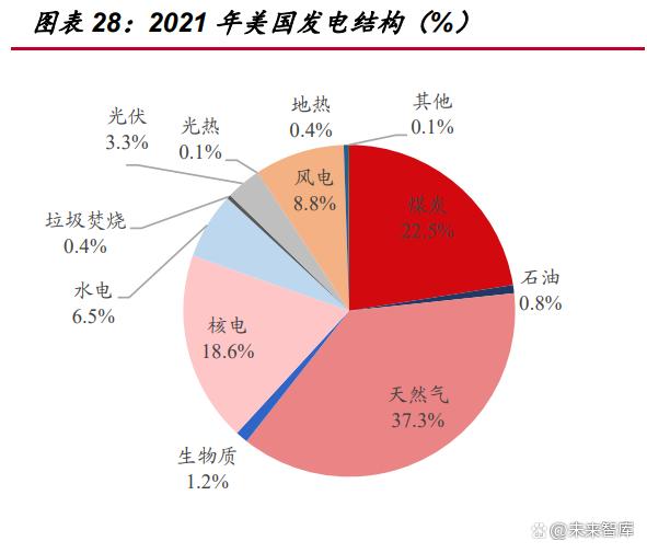 核電發(fā)電量占比穩(wěn)定。在美國(guó)發(fā)電結(jié)構(gòu)中,1990年以來(lái)核電一直維持在20% 左右水平。天然氣發(fā)電成本相對(duì)較低,21 世紀(jì)頁(yè)巖氣革命再度夯實(shí)天然氣 成本優(yōu)勢(shì),天然氣發(fā)電比例快速增長(zhǎng)。近年來(lái)天然氣價(jià)格波動(dòng)明顯,以及電 源清潔型的重視程度提升,光伏風(fēng)電成本的快速下降,其占比逐漸提升。