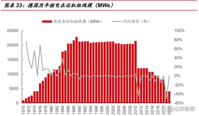 核事故安全問(wèn)題引發(fā)民眾反對(duì)態(tài)度,德國(guó)核電走出倒 U 型曲線(xiàn)。同樣受到 1974 年能源危機(jī)影響,能源獨(dú)立問(wèn)題受到關(guān)注,德國(guó)大力發(fā)展核電,直到 1989 年前德國(guó) 核電裝機(jī)都處于快速增長(zhǎng)狀態(tài)。1986 年切爾諾貝利事故后,德國(guó)核電發(fā)展陷入停滯, 最后一座新核電站于 1989 年投入使用。 2011 年福島核事故后,德國(guó)走上了堅(jiān)定退核的道路。到 2011 年初,德國(guó) 17 座 核電機(jī)組規(guī)模 21.5GW,占總電源裝機(jī)容量的 15%,核電發(fā)電量比例接近 30%。2011 年 12 月福島核電站事故后,德國(guó)多臺(tái)核電機(jī)組關(guān)停,2011 年底核電在運(yùn)規(guī)模驟降至12.1GW,2022 年底僅余 3 臺(tái)機(jī)組。規(guī)模 4.1GW。受俄烏事件和北溪管道事故影響, 德國(guó)宣布暫緩核電退出計(jì)劃,推遲關(guān)停原定 2022 年內(nèi)退役的 3 座核電站。