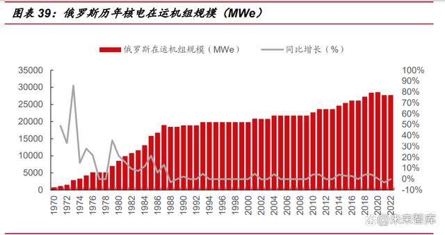 俄羅斯核電發(fā)電占比逐年穩(wěn)定攀升,目前是俄羅斯發(fā)電結(jié)構(gòu)中占比最高的清潔 能源。1986 年切爾諾貝利核電站事故后,俄羅斯核電發(fā)展趨緩,蘇聯(lián)解體后核電相 關(guān)資金短缺,直到 1990 年代開(kāi)始向中國(guó)、伊朗、印度等國(guó)出口反應(yīng)堆,資金緊張情 況得到緩解,俄羅斯核電產(chǎn)業(yè)重新回到穩(wěn)定發(fā)展軌道。核電發(fā)電量占比由 1990 年的 11%,提升至 2020 年 20%。 2022 年 2 月,俄羅斯政府宣布將為新核能發(fā)展計(jì)劃撥款約 1000 億盧布(約 13 億美元),用以建造小型核電廠(chǎng)、建立閉式燃料循環(huán)技術(shù)平臺(tái)、研發(fā)新型核燃料等。 同年 8 月,俄羅斯國(guó)家原子能公司 Rosatom 宣布計(jì)劃設(shè)計(jì)并建設(shè)一種新型高溫堆, 主要目的在于擴(kuò)大制氫規(guī)模,計(jì)劃在 2030 年左右建成。
