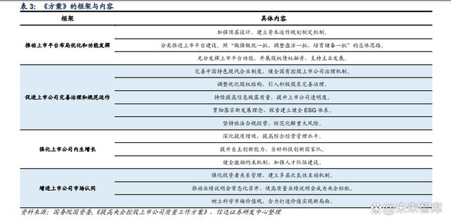 在 2022 年,《國企改革三年行動方案》的收官之年,國資委提出了《提高央企控股上市公 司質(zhì)量工作方案》(下稱《方案》),這開啟了新一輪的央企改革?!斗桨浮访鞔_了提高央 企上市公司質(zhì)量的指導(dǎo)思想和整體思路,要求中央企業(yè)要做好三個方面的統(tǒng)籌平衡,即堅持 做優(yōu)存量與做精增量結(jié)合;堅持價值創(chuàng)造與價值實現(xiàn)兼顧;堅持依法合規(guī)與改革創(chuàng)新并重。 《方案》從推動上市平臺布局優(yōu)化和功能發(fā)揮、促進上市公司完善治理和規(guī)范運作、強化上 市公司內(nèi)生增長和創(chuàng)新發(fā)展、增進上市公司市場認(rèn)同和價值實現(xiàn)等四個實施方面,提出 14 項具體工作舉措。