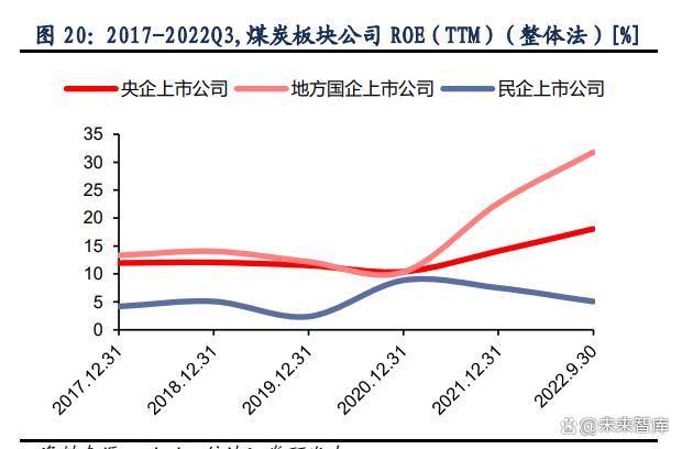 ROE 數(shù)據(jù)方面,煤炭地方國企上市公司表現(xiàn)優(yōu)于央企上市公司。受益于煤炭價格的提升, 資產(chǎn)收益率在 2020 年后迎來了大幅度增長。民企上市公司整體表現(xiàn)弱勢,ROE 呈下降趨 勢,遠(yuǎn)低于國企央企表現(xiàn)。PB 估值方面,2020 年后隨著企業(yè)經(jīng)營效益改善和煤炭板塊整體 股價的提升,國企央企上市公司的該項(xiàng)指標(biāo)也有一定程度的增長,走勢與 ROE 接近。但考 慮到 ROE 的增長幅度更為明顯,我們認(rèn)為 PB 的增長仍不足以完全反應(yīng)企業(yè)效益增長的速 度。而煤炭行業(yè)在能源政策導(dǎo)向調(diào)整與電力市場化加速推進(jìn)背景下,疊加新一輪煤礦產(chǎn)能周 期,供需或?qū)㈤L期趨緊,煤炭公司的高收益有望維持,內(nèi)在價值有望逐漸被市場認(rèn)可,估值 有望迎來進(jìn)一步修復(fù)。