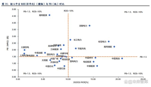 在 PB-ROE 模型中,全部 A 股上市公司的數(shù)據(jù)如下:2023/3/30 的 PB 為 1.57(MRQ), 2022 前三季度 ROE 為 8.99%。因此,我們將 PB=1.5,roe =10%作為標(biāo)準(zhǔn)進(jìn)行篩選,對 PB 估值較低且資產(chǎn)收益率較高的核心平臺分為以下三類: (1) 第一類,ROE 大于 10%且 PB 小于 1.5 的公司:中煤能源,中國海油,中國神華, 電投能源,國電電力。 (2) 第二類,PB 略大于 1.5 但 ROE 表現(xiàn)良好的公司:節(jié)能風(fēng)電。 (3) 第三類,ROE 略低于 10%且 PB 較低的公司:中國石油,中國廣核,中國石化,海 油發(fā)展,天地科技,中國核電。 從中長期來看,二級市場對股票的估值水平通常會隨著公司盈利能力的增強(qiáng)而上升,即 PB 與 ROE 理論上應(yīng)當(dāng)呈現(xiàn)正相關(guān)關(guān)系。我們認(rèn)為,以上公司是目前處于低估狀態(tài)的能源央企 核心平臺,估值修復(fù)空間較大。