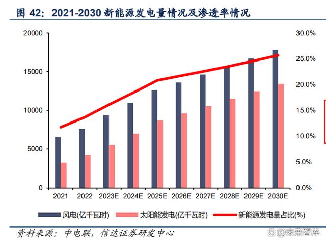 風(fēng)光電量仍將保持高增速增長,滲透率有望年內(nèi)突破 15%。2023 年 4 月 6 日,國家能源局 發(fā)布《2023 年能源工作指導(dǎo)意見》,提出“非化石能源發(fā)電裝機占比提高到 51.9%左右, 風(fēng)電、光伏發(fā)電量占全社會用電量的比重達到 15.3%。”的目標。我們假設(shè) 2023 年年內(nèi)新 增風(fēng)電和光伏并網(wǎng)裝機可達18000萬千瓦左右,根據(jù)測算(基準情景下),風(fēng)電與光伏發(fā)電 量之和的占比可提升至 16.1%。 風(fēng)光持續(xù)快速滲透,消納壓力或?qū)@現(xiàn)。我們認為,高比例新能源接入下的電網(wǎng)將面臨系 統(tǒng)性成本快速抬升的問題,輔助服務(wù)費用或?qū)⒊霈F(xiàn)指數(shù)式的上升。以國內(nèi)情況為例,2019 年全國新能源電量占比為 7%,國家能源局公布全國輔助服務(wù)費用占全社會電費比例為 1.47%;而根據(jù)山西電力現(xiàn)貨市場的經(jīng)驗,在 2022年新能源電量占比達到 16%時,其輔助 服務(wù)電費占全社會電費比例為5%左右。因此,在新能源滲透率翻一番時,輔助服務(wù)費用即 系統(tǒng)調(diào)節(jié)成本出現(xiàn)了接近翻兩番的情況,呈指數(shù)性抬升。