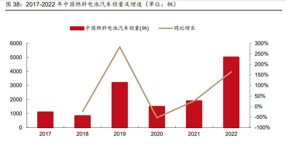 中國(guó)燃料電池汽車銷量增速明顯,商用車占據(jù)主導(dǎo)地位。2016-2019 年我國(guó)燃料電池汽 車銷量持續(xù)增長(zhǎng),2020 年受疫情和補(bǔ)貼政策退坡等因素的影響,燃料電池汽車銷量出現(xiàn) 下降,而在 2021 年燃料電池汽車銷量恢復(fù)增長(zhǎng),到 2022 年底,我國(guó)燃料電池汽車銷量 達(dá)到 5006 輛,同比增長(zhǎng) 164.17%。國(guó)內(nèi)燃料電池汽車保有量持續(xù)增長(zhǎng),2022 年達(dá)到 12306 輛,同比增長(zhǎng) 37.68%。根據(jù)《中國(guó)氫能產(chǎn)業(yè)發(fā)展報(bào)告 2022》,預(yù)計(jì)至 2025 年,中國(guó)燃料 電池汽車保有量將發(fā)展到 5-10 萬輛,預(yù)計(jì)至 2030 年,燃料電池汽車將實(shí)現(xiàn)商業(yè)化運(yùn)營(yíng)。 從車型類別來看,2022 年,我國(guó)燃料電池汽車銷量中,商用車占據(jù)主導(dǎo)地位,乘用車占比 僅為 4.47%。根據(jù)國(guó)際能源署統(tǒng)計(jì)數(shù)據(jù),在國(guó)內(nèi)燃料電池客車和商用車政策推動(dòng)下,我國(guó) 在全球燃料電池公交車和商用車領(lǐng)域中占據(jù)主導(dǎo)地位。