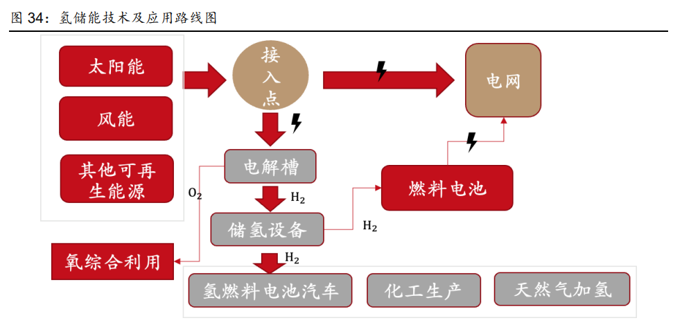 與其他儲(chǔ)能方式相比,氫能更能滿足大規(guī)模、長(zhǎng)時(shí)間消納需求。與抽水儲(chǔ)能、鋰電池儲(chǔ)能 等方式相比,其具有邊際成本低、能量密度大、無自衰減等優(yōu)勢(shì),能夠?qū)崿F(xiàn)跨周、跨季儲(chǔ) 能。但其實(shí)際應(yīng)用需要經(jīng)過光伏發(fā)電到制氫再由儲(chǔ)氫發(fā)電的兩次轉(zhuǎn)換,短期內(nèi)儲(chǔ)能效率較 低。鋰電儲(chǔ)能的效率更高,適用于日度調(diào)峰;氫能更針對(duì)于大規(guī)模儲(chǔ)能和季度調(diào)峰,擴(kuò)容 只需要增加儲(chǔ)氫設(shè)備,邊際成本更低。