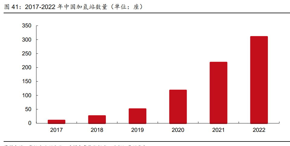 加氫站布局加快,逐漸形成網(wǎng)絡(luò)。加氫站等基礎(chǔ)設(shè)施是否完善是影響消費(fèi)者購(gòu)買氫燃料電 池汽車熱情的主要因素。隨著國(guó)內(nèi)氫燃料電池汽車?yán)塾?jì)銷量增加,中石化、中石油等能源 央企不斷加大加氫基礎(chǔ)設(shè)施的投資和建設(shè)力度,國(guó)內(nèi)加氫站數(shù)量呈現(xiàn)快速增長(zhǎng)趨勢(shì)。截至 2022 年底,我國(guó)加氫站累計(jì)建成數(shù)量達(dá)到 274 座。根據(jù) 2020 年中國(guó)汽車工程學(xué)會(huì)發(fā)布 的《節(jié)能與新能源汽車技術(shù)路線圖 2.0》相關(guān)規(guī)劃,到 2035 年加氫站的建設(shè)目標(biāo)為至少 5000 座,中國(guó)未來加氫基礎(chǔ)設(shè)施的市場(chǎng)規(guī)模在 2030-2050 年將突破千億。此外,我國(guó)加 氫站建設(shè)參與主體呈現(xiàn)多樣化趨勢(shì),采取規(guī)?;ㄔO(shè)或加油/加氫/加氣站合建等方式來拓 展加氫基礎(chǔ)設(shè)施網(wǎng)絡(luò),單位加注成本也有望下降。