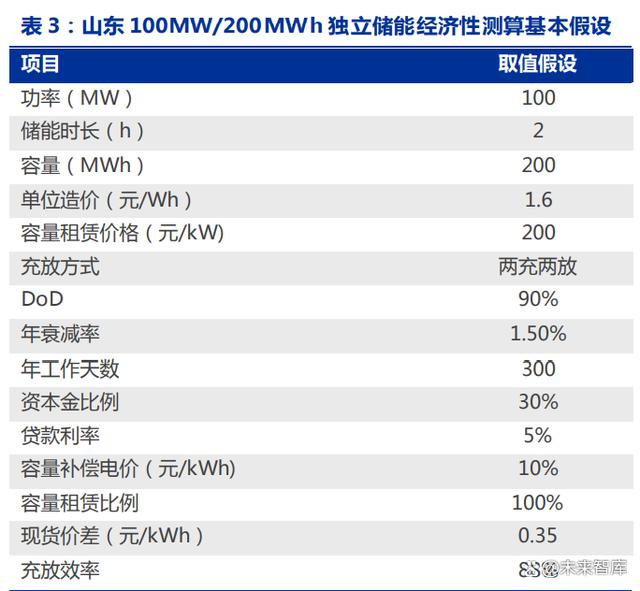 獨(dú)立儲(chǔ)能已初步具備盈利能力。以山東 100MW/200MWh 獨(dú)立儲(chǔ)能電站為例(全生命周期 10 年,循環(huán)次數(shù) 6000 次,年衰減 1.5%),其儲(chǔ)能盈利模式為現(xiàn)貨市場(chǎng)套利+容 量租賃+容量補(bǔ)償。山東省容量租賃標(biāo)準(zhǔn)采用市場(chǎng)競(jìng)價(jià)方式,制定最高限價(jià)及最低保底價(jià), 假設(shè)成交價(jià)為 200 元/kW*年,容量電價(jià)為 0.0991 元/kWh,假設(shè)現(xiàn)貨市場(chǎng)價(jià)差維持在 0.35 元/kWh,年工作天數(shù)為 300 天,儲(chǔ)能系統(tǒng)成本為 1.6 元/Wh,則其全投資 IRR 可達(dá) 7.20%。