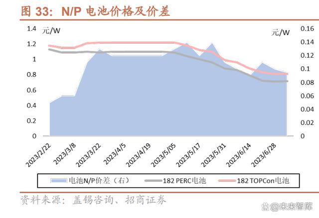下游接受度躍升。經(jīng)歷 1 年多的市場(chǎng)驗(yàn)證,下游投資方對(duì) N 型優(yōu)勢(shì)理解更加深 刻。尤其是雙面率、衰減及溫度系數(shù)等優(yōu)勢(shì)帶來的發(fā)電量增益,隨實(shí)際應(yīng)用的實(shí) 證數(shù)據(jù)逐步體現(xiàn),TOPCon 已得到行業(yè)性的認(rèn)可。近期部分招標(biāo)項(xiàng)目 N 型份額 已由此前 10%上下提升至近 50%。2021 年 PERC 市占率約 91%,2022 年降至 88%,而 N 型份額由 2021 年 3%提升至 9%,N 型電池進(jìn)入規(guī)?;瘧?yīng)用階段。 溢價(jià)不斷放大。近期 N 型組件與 P 型組件的價(jià)差,已由 2 月的 0.05 元/W 逐步 攀升至 0.06-0.14 元/W(近期組件報(bào)價(jià)偏分散),整體溢價(jià)逐步放大,原因主要 系隨 N 型產(chǎn)品進(jìn)一步降本增效、電站有效驗(yàn)證的形成,TOPCon 優(yōu)勢(shì)不斷驗(yàn)證, 下游對(duì) N 型組件的需求優(yōu)先級(jí)更高,高效組件的議價(jià)能力更強(qiáng)。如果效率繼續(xù)提 升,溢價(jià)有望進(jìn)一步放大。而 TOPCon 電池供應(yīng)相對(duì)緊張,相較 PERC 溢價(jià)由 0.06 元/W 上下爬升至 0.1 元/W。