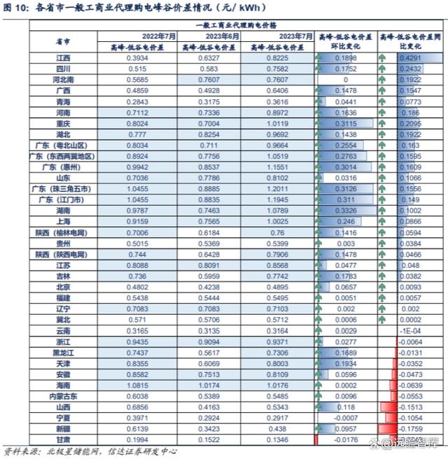 全國(guó)峰谷價(jià)差大于 0.7 元/kWh 的省份已達(dá) 19 個(gè),且價(jià)差呈擴(kuò)大趨勢(shì)。0.7 元/kWh 為工商業(yè)儲(chǔ)能具備經(jīng)濟(jì)性的峰谷價(jià)差門檻值。數(shù)量變化上,2022 年 7 月至 2023 年 7 月,我國(guó)峰谷價(jià)差超過 0.7 元/kWh 的省份從 16 個(gè)增加至 19 個(gè)。價(jià)差變化上,共有 20 個(gè)地區(qū)的峰谷價(jià)差增大,如江西省從0.3934/kWh 提升至 0.8225/kWh,山東省從 0.7036/kWh 提升至 0.8102/kWh。各地峰谷價(jià)差普遍拉 大,意味著配置工商業(yè)儲(chǔ)能的套利空間擴(kuò)大。