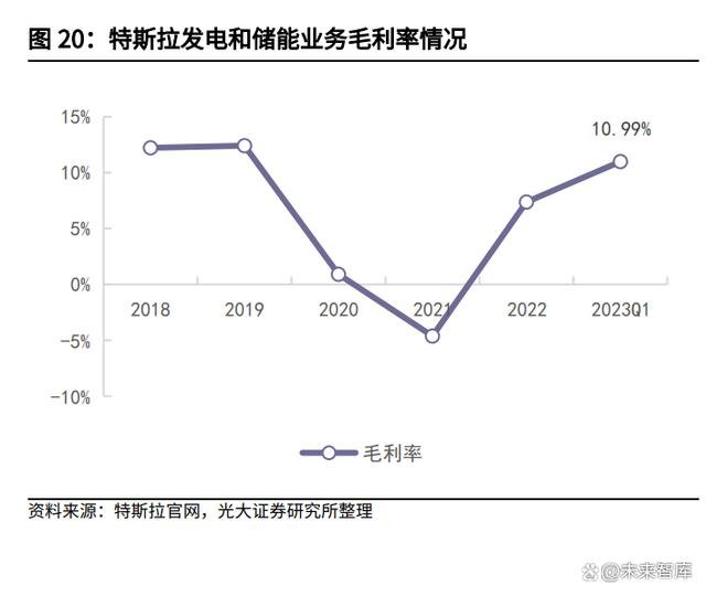 特斯拉發(fā)電和儲能業(yè)務(wù)營業(yè)收入除2019年外均穩(wěn)健增長,2020年到2022年增速均超過30%,發(fā)電和儲能業(yè)務(wù)毛利率在2019年-2021年有所下降,2022-2023第一季度明顯回升。在新能源大規(guī)模裝機(jī)和電網(wǎng)加大投資的背景下,家用級、商用級和公用級能源產(chǎn)品需求量不斷提升,儲能裝機(jī)量自2018年起逐年增加。2023年第一季度特斯拉該業(yè)務(wù)實現(xiàn)營業(yè)收入13.61億美元,同比增長148.21%,毛利率為10.99%。2023年4月,特斯拉宣布在中國上海新建儲能超級工廠(Megafactory),計劃于2024年第二季度投產(chǎn),初期規(guī)劃公用儲能電池年產(chǎn)量達(dá)1萬臺,儲能規(guī)模近40GWh,和2022年相比產(chǎn)能直翻六倍多,儲能市場前景廣闊。
