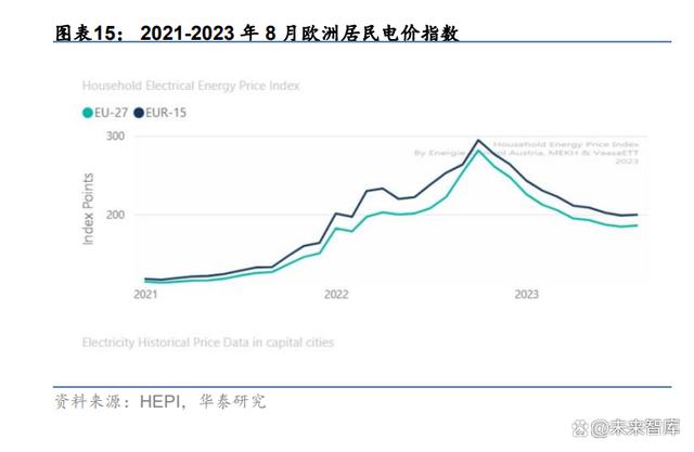 歐洲居民電價(jià)決定機(jī)制與構(gòu)成:歐洲電力現(xiàn)貨市場價(jià)格由能源供需決定,采取邊際成本定 價(jià)。在建立碳排放體制后,目前氣電多為出清價(jià)格,所有中標(biāo)機(jī)組電價(jià)按照氣電價(jià)格結(jié)算, 隨其變化。居民側(cè)不直接參與電力市場,由運(yùn)營商/售電公司提供電價(jià)緩沖。居民直接與售 電公司簽訂合約鎖定付費(fèi)方式,確定未來 1-2 年用電價(jià)格。從價(jià)格構(gòu)成看,發(fā)電側(cè)傳導(dǎo)至 用戶側(cè)還需要附加額外的輸配電費(fèi)、稅費(fèi)和增值稅。根據(jù) HEPI 2023 年 1-8 月數(shù)據(jù),歐洲 各國平均用戶側(cè)電費(fèi)中能源價(jià)格占比 58%,輸配電費(fèi)占比 23%,稅費(fèi)占比 5%,增值稅占 比 14%。