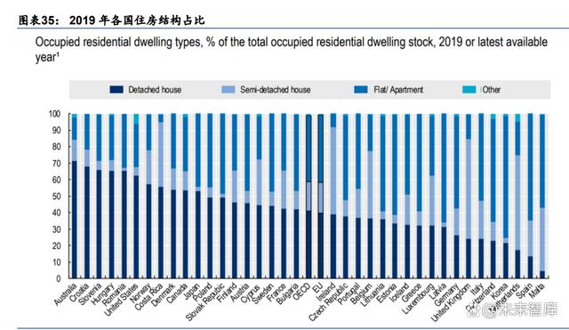 遠(yuǎn)期空間:美國房屋結(jié)構(gòu)具有天然優(yōu)勢,戶儲可利用屋頂面積高。戶用光伏和儲能設(shè)備通 常被安裝在家庭住房的屋頂上。因此,住房的類型、屋頂?shù)拿娣e大小等也直接決定了戶儲 的安裝難度和長期安裝需求,相對來說,獨(dú)立住房比高層樓房單戶房頂面積多,能夠安裝 更多戶儲,結(jié)構(gòu)也更適合當(dāng)前的分布式戶儲設(shè)備。根據(jù) OECD,美國 2019 年獨(dú)立住房和半 獨(dú)立住房的占比接近 70%,在統(tǒng)計(jì)的多個(gè)國家中排行第 6 名。根據(jù)美國經(jīng)濟(jì)分析局,2022 年美國人口 3.34 億,我們保守估計(jì)獨(dú)棟住房 6000 萬套,按 10%的滲透率、平均每戶 10kWh 計(jì)算,戶儲容量約為 600GWh,戶儲市場遠(yuǎn)期想象空間大。