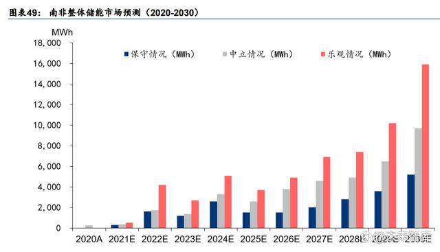 政策刺激疊加電力危機(jī),南非戶儲市場增長預(yù)計(jì)有可持續(xù)性。為了緩解電力危機(jī),南非政 府宣布 2023 與 2024 年全國電價(jià)將分別調(diào)漲 18.56%與 12.74%,以此來抑制居民用電需求。 從 23 年最新數(shù)據(jù)來看,23 年 1-7 月中國向南非出口逆變器累計(jì) 31.08 億元,同比+487.7%; 平均價(jià)格 2152.0 元/臺,同比 22 年 1-7 月+105.6%,中國出口南非逆變器價(jià)量雙升??紤] 到南非亦在跟隨全球腳步逐步擺脫煤炭發(fā)電依賴,燃煤電站大規(guī)模建設(shè)受阻,電力問題短 期無法解決,我們認(rèn)為南非儲能市場的高增速具有較好的持續(xù)性。根據(jù)世界銀行預(yù)測, 2020-2030 年南非儲能電池裝機(jī)的年復(fù)合增速在 34%-50%之間,在悲觀/中性/樂觀場景假 設(shè)下,2030 年南非儲能電池裝機(jī)量將達(dá)到 5.2/9.7/15.9GWh。