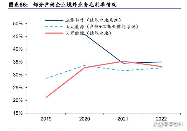 對比成熟的家電行業(yè):我們選取發(fā)展相對比較成熟的家電行業(yè)進(jìn)行對比,家電企業(yè)做境外 業(yè)務(wù)主要有出口自有品牌、海外并購、ODM/OBM/OEM 代工三種模式。我們通過對比發(fā)現(xiàn), 選擇自有品牌模式的樂歌股份、安克創(chuàng)新、石頭科技、星徽股份能夠在境外獲得更高的毛 利率,我們計(jì)算四家企業(yè) 2018-2022 年境外與境內(nèi)的毛利率差值均值為 10.65pct。同時(shí), 由于能夠選擇以自有品牌打海外市場的公司產(chǎn)品具有較強(qiáng)的產(chǎn)品力,其整體毛利率通常也 處于較高水平。戶儲產(chǎn)品在一定程度上具有家電屬性,國內(nèi)儲能產(chǎn)業(yè)鏈發(fā)展國際領(lǐng)先,具 有強(qiáng)產(chǎn)品力與品牌力,隨著后續(xù)行業(yè)競爭加劇,我們認(rèn)為穩(wěn)態(tài)下戶儲行業(yè)優(yōu)質(zhì)企業(yè)仍能夠 維持高出國內(nèi)市場平均 5 個(gè)百分點(diǎn)以上的毛利率水平。
