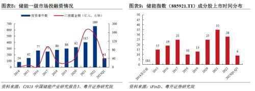 從儲能公司投融資角度來看,近兩年儲能一級和二級市場投融資熱度高漲。不完全統(tǒng)計(jì)數(shù)據(jù)顯示,截至2023年一季度,300余家儲能企業(yè)獲得融資,涉及投融資事件900余件、已披露融資金額近2000億元。其中,2021年儲能披露融資金額近600億元,2022年儲能行業(yè)全年融資189次。二級市場方面,近三年儲能相關(guān)公司IPO多達(dá)97家,占儲能指數(shù)(885921.TI)比重達(dá)24.8%,此外也有部分上市公司于近些年實(shí)現(xiàn)儲能業(yè)務(wù)的突破和轉(zhuǎn)型。