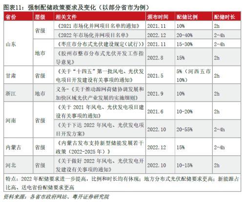 強(qiáng)制配儲政策客觀上拉動儲能裝機(jī)需求。2021年2月,國家發(fā)改委、能源局出臺《關(guān)于推進(jìn)電力源網(wǎng)荷儲一體化和多能互補(bǔ)發(fā)展的指導(dǎo)意見》,明確增量風(fēng)光儲一體化要優(yōu)化配套儲能規(guī)模,充分發(fā)揮儲能調(diào)峰、調(diào)頻作用。5月出臺的《關(guān)于2021年風(fēng)電、光伏發(fā)電開發(fā)建設(shè)有關(guān)事項(xiàng)的通知》也指出保障性并網(wǎng)以外的項(xiàng)目,需通過自建、合建共享或購買服務(wù)等市場化方式落實(shí)并網(wǎng)條件后并網(wǎng)。自此,多地相繼發(fā)布電源側(cè)風(fēng)光強(qiáng)制配儲政策,多要求10%/2h的配置比例和時長,并且政策要求逐漸向15-30%和4-5h的高比例、長時儲能發(fā)展。事實(shí)上,多地風(fēng)光項(xiàng)目招標(biāo)競爭過程中,實(shí)際配儲情況高于政策要求。