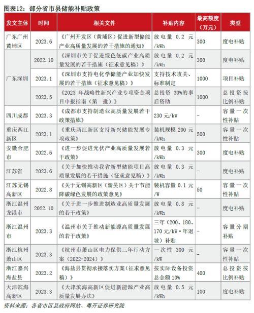2、行業(yè)價格政策方面,地補(bǔ)政策和電價政策持續(xù)改善收益端。儲能行業(yè)補(bǔ)貼政策以地方補(bǔ)貼為主,包括度電補(bǔ)貼和投資補(bǔ)貼兩種。各地為吸引儲能投資、加快當(dāng)?shù)貎δ苄袠I(yè)發(fā)展,其補(bǔ)貼力度較高,政策出臺層級細(xì)分至縣區(qū)級,充分體現(xiàn)儲能行業(yè)發(fā)展高景氣。長期來看市場化體制機(jī)制是保障儲能發(fā)展的關(guān)鍵,電價政策正是盈利機(jī)制的主要影響因素,近年來我國儲能發(fā)展相關(guān)的電價政策在不斷完善中。