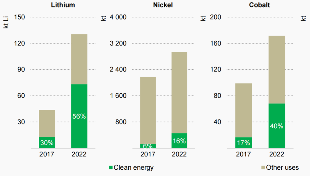 圖4 清潔能源應(yīng)用占鋰、鎳、鈷需求比重 (來源:IEA)
