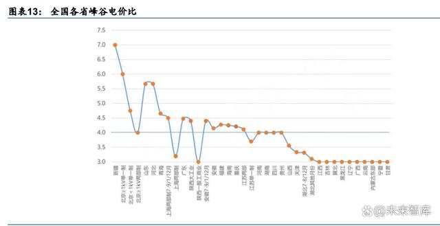 國家發(fā)改委推動合理拉大峰谷電價差,引導電力用戶削峰填谷。2021 年 7 月,國家發(fā)改委 印發(fā)《關于進一步完善分時電價機制的通知》,部署各地進一步完善分時電價機制,合理拉 大峰谷電價價差,為引導電力用戶削峰填谷、促進儲能加快發(fā)展釋放了清晰強烈的價格信 號:(1)優(yōu)化峰谷電價機制:積極優(yōu)化峰谷電價機制,科學劃分峰谷時段,合理確定峰谷 電價價差,系統(tǒng)峰谷差率超過 40%的地方,峰谷電價價差原則上不低于 4:1;其他地方原 則上不低于 3:1。(2)建立尖峰電價機制:在峰谷電價的基礎上推行尖峰電價機制,主要基 于系統(tǒng)最高負荷情況合理確定尖峰時段,尖峰電價在峰段電價基礎上上浮比例原則上不低 于 20%??蓞⒄占夥咫妰r機制建立深谷電價機制。隨后,各省市分時電價政策步入快速完 善期,出臺相關政策調(diào)整峰谷時段劃分和電價浮動比例。
