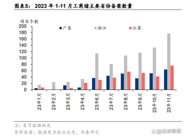 多因素推動,23 年高增趨勢初現(xiàn)。根據(jù)能源電力說公眾號的不完全統(tǒng)計,僅 2023 年 7-11 月,國內(nèi)工商業(yè)儲能備案項目個數(shù)達 1305 個。從工商業(yè)分布較為集中的廣東、浙江、江蘇 三個省份來看,月度備案項目數(shù)量均呈現(xiàn)大幅上升趨勢。據(jù)不完全統(tǒng)計,2023 年以來我國 工商業(yè)儲能備案規(guī)模已經(jīng)達到 3.46GW/9.26GWh。工商業(yè)儲能高速增長的勢頭已經(jīng)初步顯 現(xiàn),2023 年成為國內(nèi)工商儲的放量元年。