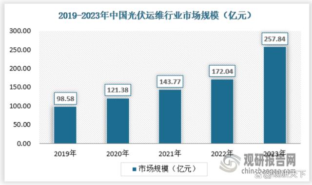 在雙碳目標(biāo)推進(jìn)下,光伏行業(yè)將長期處于高速發(fā)展期,將帶動光伏運維行業(yè)進(jìn)一步發(fā)展。伴隨我國光伏發(fā)電累計裝機容量增長迅速,光伏運維市場需求持續(xù)增加,行業(yè)迎來黃金發(fā)展期。2022年我國光伏累計裝機容量約為393GW,2023年我國光伏累計裝機容量約為609GW,同比增長超過55%,因此在光伏累計裝機容量快速增長的情況下,2023年我國光伏運維行業(yè)市場規(guī)模達(dá)到257.84億元,同比2022年增長49.87%。