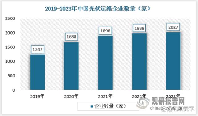 隨著我國光伏行業(yè)的發(fā)展,光伏裝機量的增長,對光伏運維需求的增加,我國光伏運維企業(yè)數(shù)量呈上升趨勢,2023年我國光伏運維企業(yè)數(shù)量達(dá)到2027家。