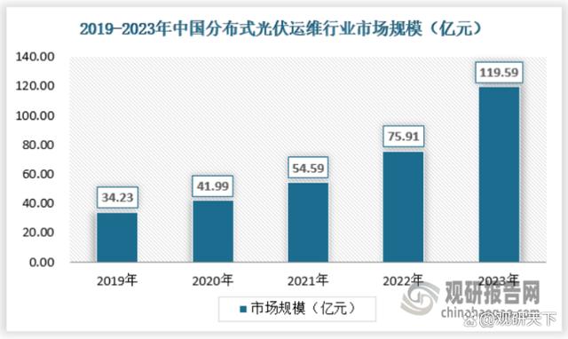 2023年分布式光伏運維市場達(dá)到119.59億元。2023年新增分布式光伏裝機容量約為96GW,同比增長88.39%,2023年累計分布式光伏裝機容量約為254W,同比增長60.88%,因此2023年市場規(guī)模較2022年增長57.53%,具體如下: