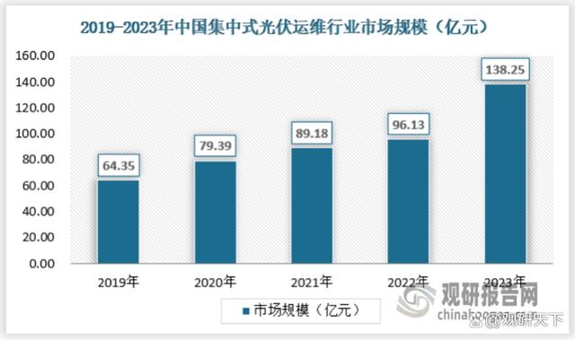 集中式光伏電站是指在荒漠、戈壁等地區(qū)建設(shè)的大型光伏電站,規(guī)模較大,發(fā)電直接并入公共電網(wǎng),供給遠(yuǎn)距離負(fù)荷。這種電站的建設(shè)需要大量資金投入,但可以有效利用豐富的太陽能資源,降低運輸成本。目前我國光伏發(fā)電結(jié)構(gòu)中,集中式光伏占據(jù)主要地位,因此集中式光伏運維市場規(guī)模較大,2023年達(dá)到138.25億元。2023年新增集中式光伏裝機容量約為120GW,同比增長230.71%,2023年累計集中式光伏裝機容量約為354W,同比增長51.19%,因此2023年市場規(guī)模較2022年增長迅速,行業(yè)市場規(guī)模同比增長43.81%,具體如下: