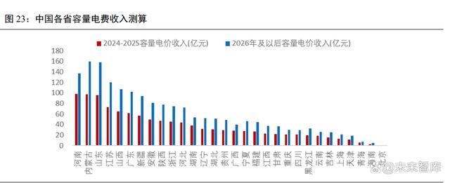 (3)煤電機組最大出力;煤電機組可獲得的容量電費,根據(jù)當?shù)孛弘娙萘侩妰r和機組申報的最大出力確定,假設 h 最大出力按額定容量的 100%。 按照各省煤電容量電價水平及煤電裝機容量(按容量電價適用率90%)測算,2024-2025年全國煤電容量電價收入預計 1121 億元,2026 年以后達到 1792 億元以上(不考慮煤電裝機變動情況,以及按