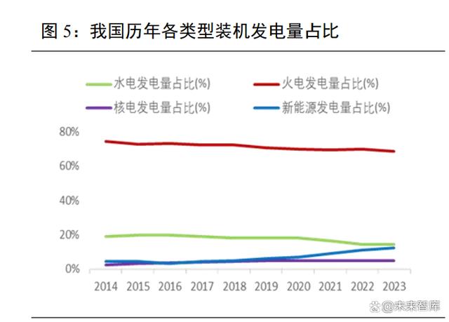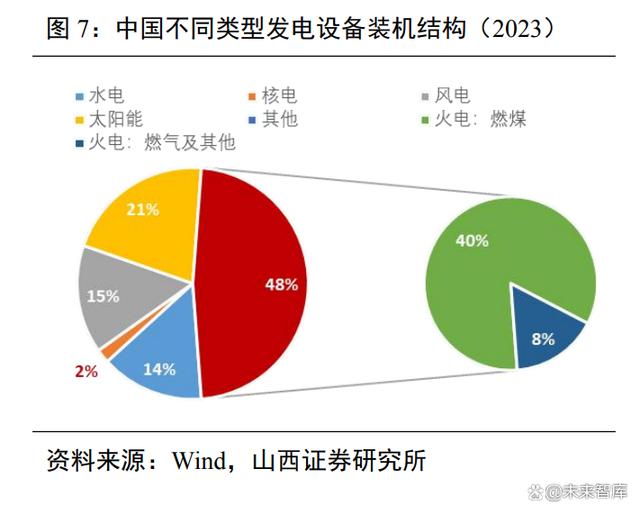 目前我國電力發(fā)電結構仍以火電為絕對主力。截止 2023 年底,我國電力總裝機29.2億千瓦,火電、水電、核電、風電及太陽能分別占比 47.62%、14.44%、1.95%、15.12%和20.88%;其中,燃煤火電占比 39.9%,風能和太陽能合計占比 36%。從發(fā)電結構來看,2023年我國規(guī)上發(fā)電設備總發(fā)電量 8.91 萬億千瓦時,火、水、核、風、太陽能分別占比69.95%、12.81%、4.86%、9.08%、3.30%。
