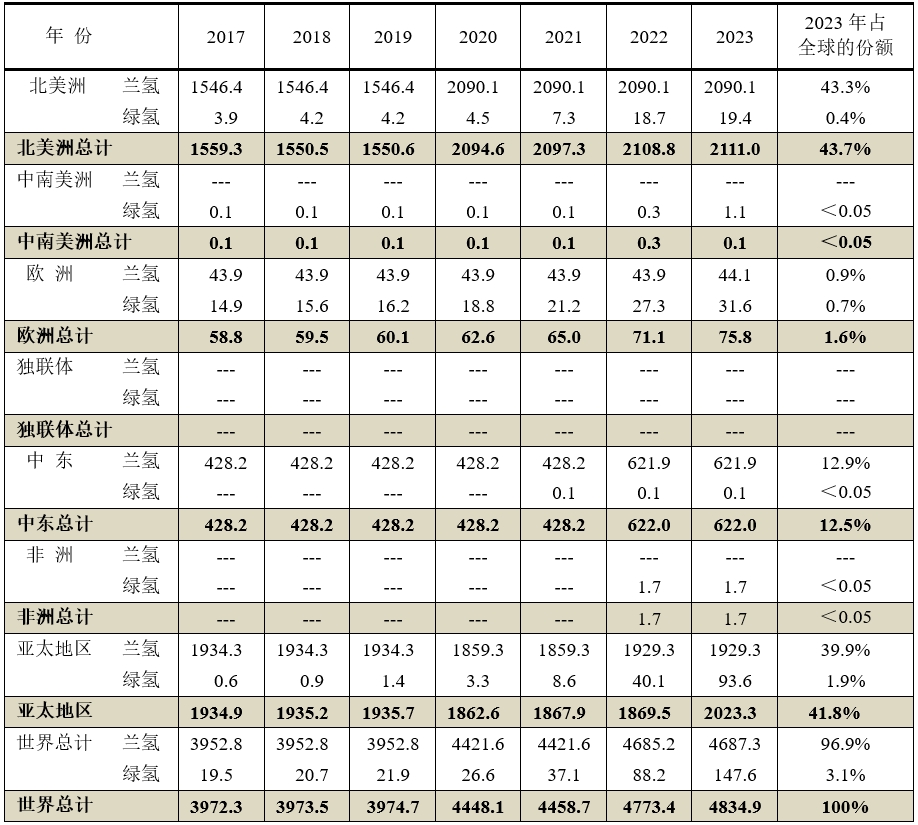 縱觀全球2023年氫氣生產仍然以從化石燃料制氫“蘭氫”為主,占96.9%,而從再生能源制氫“綠氫”為輔,僅占3.1%,再生能源制氫是發(fā)展方向,但中南美洲、獨聯體、非洲等地區(qū)的蘭氫沒有行動;獨聯體、中東和非洲的“綠氫”也沒有行動。