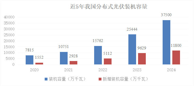 截至2024年末,全國光伏發(fā)電裝機容量達8.86億千瓦,同比增長45%,排在火電之后,位居第2位,其中集中式光伏5.11億千瓦,分布式光伏3.75億千瓦。全年光伏新增裝機2.78億千瓦,同比增長28%,其中集中式光伏1.59億千瓦,分布式光伏1.18億千瓦。全年光伏發(fā)電量達到8341億千瓦時,同比增長44%,但仍落后于核電的發(fā)電量,排在第5位。全年發(fā)電利用小時數(shù)為1211小時,發(fā)電上網(wǎng)利用率96.8%,較上年有所降低。