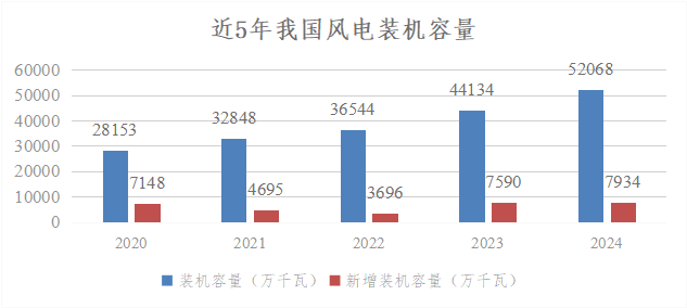 截至2024年末,全國風電累計并網(wǎng)容量達到5.21億千瓦,同比增長18%,其中陸上風電4.8億千瓦,海上風電4127萬千瓦,在全國電力裝機中排在第3位。全年新增裝機容量7982萬千瓦,同比增長6%,其中陸上風電7579萬千瓦,海上風電404萬千瓦。從新增裝機分布看,“三北”地區(qū)占全國新增裝機的75%。2024年,全國風電發(fā)電量9916億千瓦時,同比增長16%,僅次于火電和水電,排在第3位;全年并網(wǎng)發(fā)電利用小時數(shù)為2127小時,平均上網(wǎng)利用率95.9%。