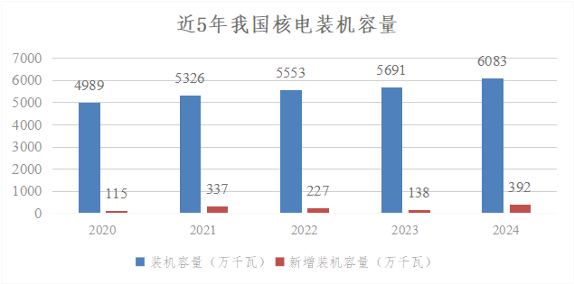 2024年是我國核電發(fā)展具有里程碑的一年,全年新核準11臺核電機組,為歷年核準數(shù)量之最,連續(xù)3年核準機組數(shù)量超過10臺;投入運行核電機組2臺,新增額定裝機規(guī)模240萬千瓦;在運、在建和核準待建核電機組共有102臺,總裝機容量1.13億千瓦,連續(xù)2年位居全球首位。截至當年末,全國運行核電機組共有57臺(不含臺灣地區(qū)),額定裝機容量為5943.17萬千瓦。全年累計核電發(fā)電量為4451.75億千瓦時,比上年同期上升了2.72%,占全國累計發(fā)電量的4.73%,超過太陽能發(fā)電量,排在第4位。由此可見,我國核電裝機占全國總裝機的比例不到2%,但發(fā)出的電量接近全國總發(fā)電量的5%。年設備利用小時數(shù)為7805.74小時,平均機組能力因子為90.26%。