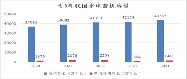水電作為常規(guī)電力中唯一的可再生能源,2024年總體呈現(xiàn)出穩(wěn)定增長的發(fā)展趨勢,并且在全球范圍內(nèi)保持領(lǐng)先地位。截至當年底,我國水電總裝機容量達到4.36億千瓦,占我國電力總裝機的13.02%,較2023年新增裝機容量1378萬千瓦,同比增長3.2%,其中,常規(guī)水電裝機規(guī)模3.77億千瓦、同比增加625萬千瓦;抽水蓄能裝機規(guī)模5869萬千瓦、同比增加753萬千瓦。全年水電發(fā)電量14239億千瓦時,占發(fā)電總量的13.53%,僅次于火電,排在第2位;規(guī)模以上水電年平均利用小時數(shù)為3349小時。在雙碳目標和新能源快速發(fā)展的大背景下,水電以其穩(wěn)定、清潔的特點,成為我國清潔能源供應的可靠保證。