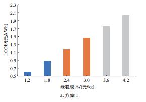 通過兩個(gè)方案進(jìn)行燃料電池儲(chǔ)能經(jīng)濟(jì)性評(píng)估,均按容量為1 MW 的燃料電池計(jì)算,運(yùn)行周期為10 年,固定資產(chǎn)殘值為10%,用氫量為83.5 t/ 年。其中,方案A 為燃料電池發(fā)電,年利用小時(shí)數(shù)為2000 h,轉(zhuǎn)化效率為60%,發(fā)電量為200 萬kWh;方案B 為燃料電池?zé)犭娐?lián)供,年利用小時(shí)數(shù)為3000 h,轉(zhuǎn)化效率為90%,發(fā)電量為300 萬kWh。兩種方案的不同綠氫成本對(duì)應(yīng)的LCOE 如圖3 所示。