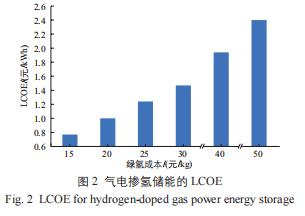 按1 臺(tái)容量為50 萬kW 的燃?xì)鈾C(jī)組100%摻氫計(jì)算,燃?xì)怆娬就顿Y單價(jià)為2600 元/kW,增加儲(chǔ)氣設(shè)施的投資為3000 萬元,年利用小時(shí)數(shù)為3000 h,運(yùn)行周期為20 年,固定資產(chǎn)殘值為10%。按等熱值換算后的燒氫量為7 萬t/ 年,發(fā)電量為15 億kWh,計(jì)算得到不同綠氫成本對(duì)應(yīng)的氣電摻氫儲(chǔ)能的LCOE,具體如圖2 所示。