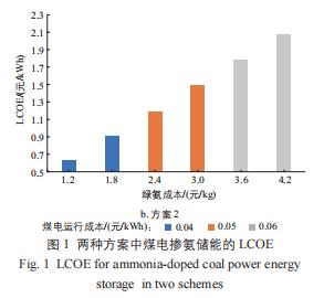 考慮煤電運(yùn)行成本的影響( 煤電運(yùn)行成本隨綠氨成本下降而下降),計(jì)算得到兩種方案中不同綠氨成本對(duì)應(yīng)的煤電摻氨儲(chǔ)能的LCOE,具體如圖1 所示。