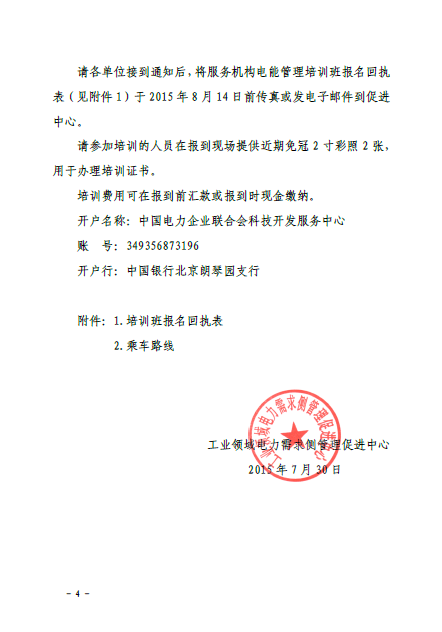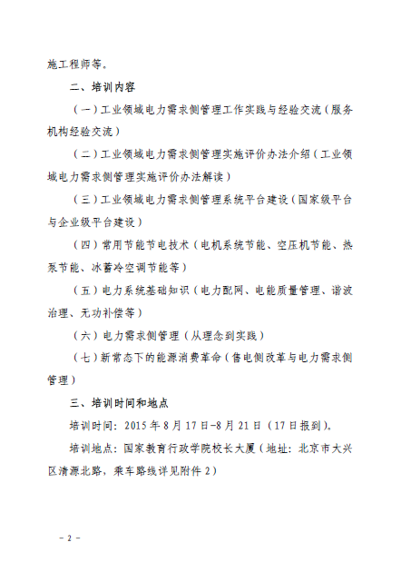 附件: 1、關于舉辦工業(yè)領域電力需求側(cè)管理服務機構電能管理培訓班通知(工電促[2015]8號) 2、電能管理培訓班報名回執(zhí)