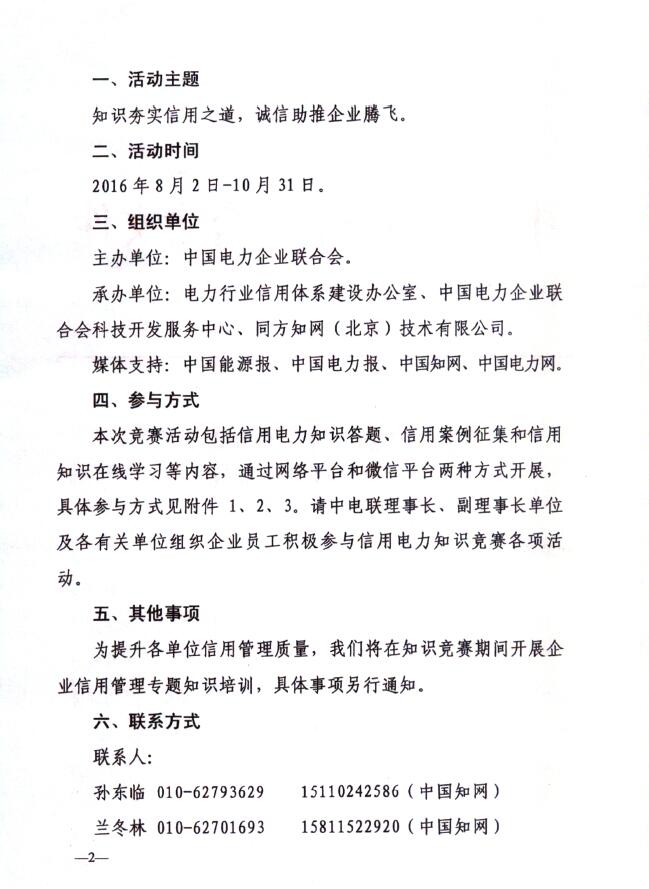 本次競賽活動時間為2016年8月2日—10月30日,期間可進入中國電力企業(yè)聯(lián)合會:http://www.cec.org.cn/、中國電力網(wǎng):http://xtfk.cn/、信用電力網(wǎng):http://www.ceccr.cn/、中國知網(wǎng):http://www.cnki.net/、http://www.dl.cnki.net、中國能源網(wǎng):http://www.cnenergy.org/參與活動,并獲取更多相關資訊。